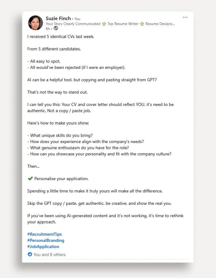 // Proof read everything, ask yourself - does it sound authentic as you. A common mistake I see a lot is when people over exagerate their skills and achievements, it tells me immediately “this was created by AI”.